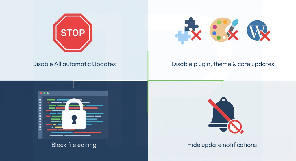 - Disable WordPress Automatic Updates, File Editing, and NotificationsBy default, WordPress automatically checks for updates, installs some updates in the background, and allows file editing directly from the dashboard. While this is convenient for some, many developers and site owners prefer to have full control over when updates happen and who can edit files.